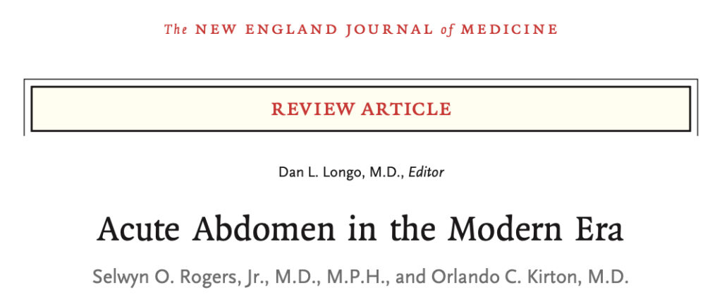 - Rogers SO Jr, Kirton OC. Acute Abdomen in the Modern Era. N Engl J Med. 2024 Jul 4;391(1):60-67.